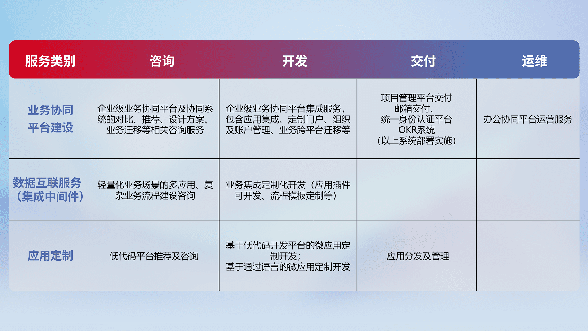 针对钉钉、、、、企微、、、IDaas等平台级产品提供产品的规划、、、方案、、、、交付、、、定制化开发等服务,,实现如统一协同办公、、智能客户服务、、、混合会议管理、、智能数据查询、、、、等业务场景,,实现数字化转型。。。。