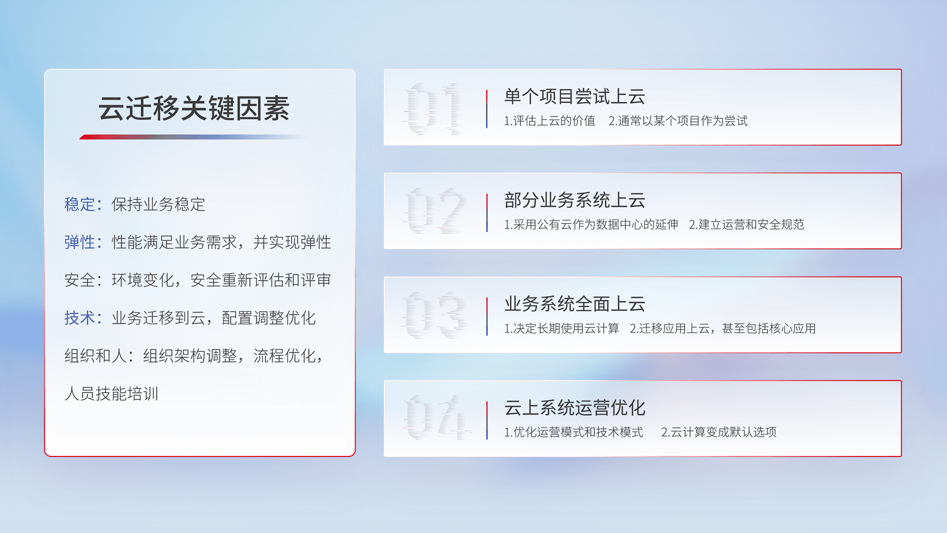 结合实际业务,,从规划设计、、、、云平台选型、、云原生改造、、数据迁移、、集成交付,,迁移全过程为客户识别最佳上云路径,,做好风险识别管理,,,设计网络架构、、、、身份权限、、、安全审计合规、、、、操作审计、、、日志审计、、、监控告警策略、、多站点容灾设计等,,对云上基础设施进行整体规划,,,提升IT治理水平,,,以满足弹性、、、高可用、、高性能的需求。。。