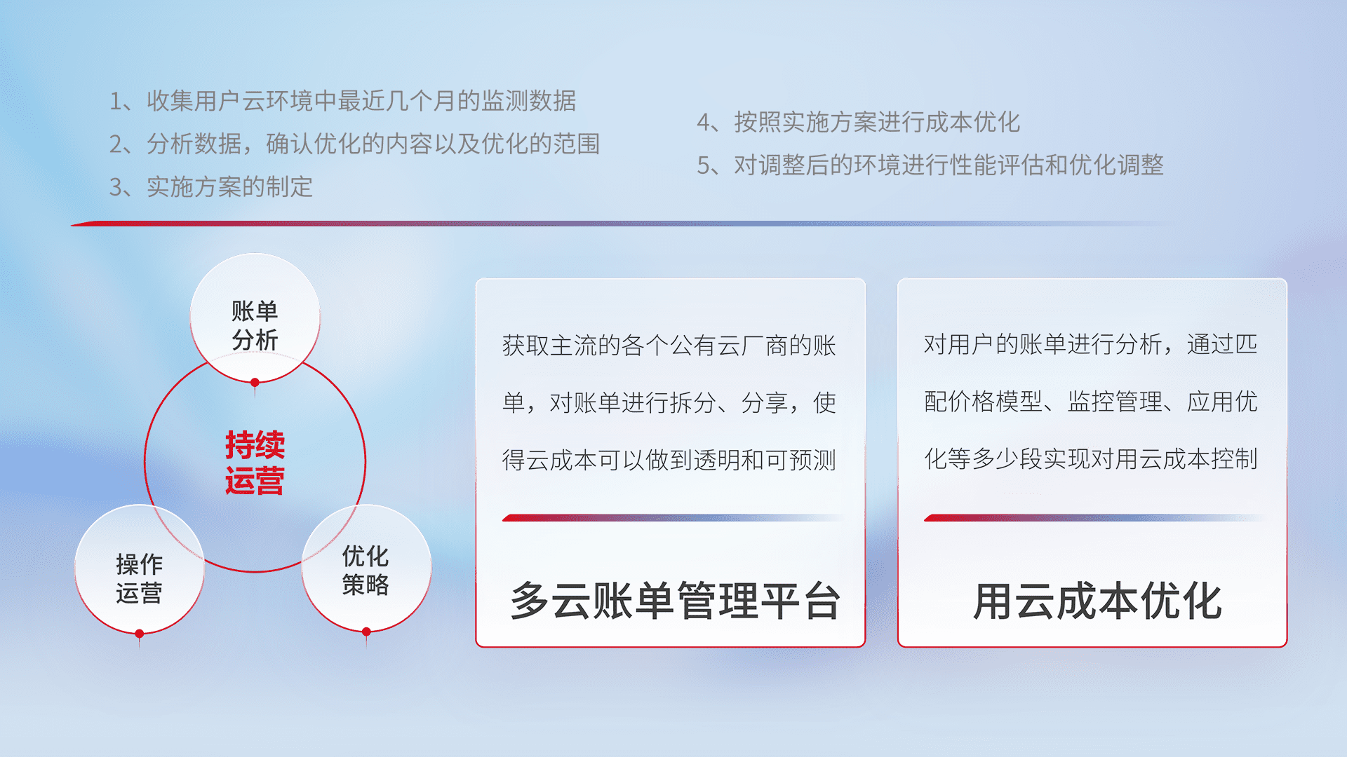 通过多云纳管,,以统一的资源数据模型把客户的云资源进行抽象和封装,,,进而实现对多云资源的统一操作,,,保障云资源管理的可靠性、、、、稳定性与可用性。。。量身定制化运维内容,,,配置、、开发运维、、补丁管理、、、、备份、、、、监控、、认证和访问管理、、、审计和日常巡检等,,,,保障在用云过程中的可靠度,,稳定度以及高可用率。。。