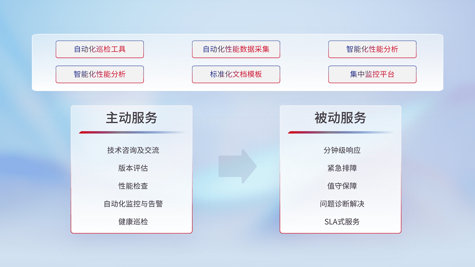 智能化工具和标准化文档,,,,保障服务质量,,,,提供主动服务(包含技术咨询、、、版本评估、、、、性能检查、、、、自动化监控与告警、、健康巡检)和被动服务包含(分钟级响应、、、、紧急排障、、、值守保障、、、问题诊断解决、、SLA服务)。。。。